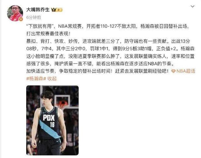 11月22日,《Hot News》援引米格篮球报道称,NBA副总裁马克·塔图姆参加节目并谈到了NBA在国外的情况,他说:“在亚洲,我们的联赛是第一。这是千真万确的。比如在中国,我们是第一运动。在中国,有3亿人打篮球。即使在菲律宾,篮球也是第一运动,而不是足球。亚洲的人口是15亿比2”。开拓者队夏季联赛在中国的收视率高于总决赛,中国和亚洲市场对我们来说是非常重要的市场。据红星新闻报道,北京时间19日下午,扬·汉森在八场比赛后首次亮相NBA。在开拓者队对阵太阳队的比赛中,在发展联盟训练的扬·汉森回到了球队。 H他出战13分8秒,得到9分、5个篮板和3次助攻。他的得分、篮板和助攻都创下了NBA常规赛的新纪录。对此,@DaimouthHanQiaosheng 19日写道:“降职有帮助。”在NBA常规赛中,开拓者队以110-127输给了太阳队。本赛季最佳表现!一次扣篮,一次背身,一次反击,一次精彩传球,让他在进攻端仅落后三分。他在防守端也做出了贡献。他打了13分钟。扬·汉森三分2中0,罚球1中1,砍下9分1投+2分,显然没有进入夏季联赛时那么肿了。可以看到扬·汉森正在逐渐适应NBA的节奏。改变您的节奏并以稳定的轮班时间表为目标! “打开百度应用,欣赏高分辨率图片。扬·汉森此前曾引起关注,因为他经常被送去训练联盟,然后退役。”11月2日,开拓者队在今年首轮选中了16名球员。官方宣布,第一名入围的中国球员杨汉森已被派往发展联盟成员队伍Tier City Mix进行常规训练。据荆楚网报道,开拓者队记者Sean Hikin报道称,开拓者队此举是为了让扬·汉森有更多的训练时间,他将重新归队参加周一对阵湖人队的比赛。 11月3日,波兰开拓者队官方宣布从混合发展联盟球队召回中锋扬·汉森。 照片发布后,5日,开拓者队官方消息称,球队已将扬·汉森交易至G联赛(NBA发展联盟)的Tier City Mix球队。当天的训练结束后,扬·汉森被从混合队中除名。开拓者队5日中午正式宣布,将扬·汉森退出发展联盟。11月14日,波特兰开拓者队发布消息:“官方公告:波特兰开拓者队已将扬·汉森送入发展联盟男女混合队。”颜·汉森将在本周六(北京时间)对阵山谷太阳队,下周一对阵南湾湖人队。“请自我介绍一下。”据白鹿视频@杨瀚SONatetudio发布的11月5日照片,回应近期杨瀚森的争议。全文如下: 1、NBA赛前训练期间,开拓者队给每位球员15分钟的热身时间。每个球员在这段时间都有不同的训练方案,有的只是力量训练,有的则是伸展运动。球队的更衣室教练对球员也有不同的安排,所以球迷在赛前或中场时看不到杨是很正常的事情。扬·汉森的一日三餐中有两顿是球队在开拓者队客场对阵湖人队的比赛结束后特意准备的,扬·汉森去了洛杉矶当地的一家餐馆。洛杉矶在球队工作人员的指导下吃饭。虽然球队不得不安排飞往盐湖城的航班,但开拓者队将不得不适应和改进NBA竞技比赛的节奏和饮食。据开拓者队记者丹尼·马兰透露,扬·汉森今后在开拓者队的上场时间将受到限制,他很看重在NBA打球的机会,并且已经能够适应发展联盟的额外训练,并计划根据球队的安排做出具体的改进。 @腾讯NBA的纪录片《大跃进新秀赛季》第一集播出,扬·汉森谈及被送到发展联盟:去NBA发展联盟并没有什么错。心理上还是有期待的,因为我和团队已经想到了。我也是公司第一年的新员工。我团队中的很多人告诉我要慢慢来,冷静下来。 》来源:九拍新闻综合热点新闻、红星新闻、北青体育、白鹿视频、体育周报、往期报道等